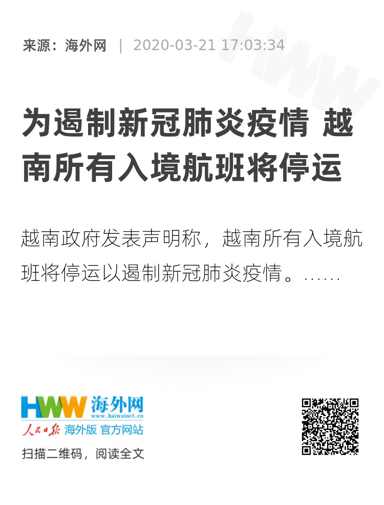 【海外网3月21日|战疫全时区】据越南快报(vnexpress)报道,越南政府发表声明称,越南所有入境航班将停运以遏制新冠肺炎疫情。