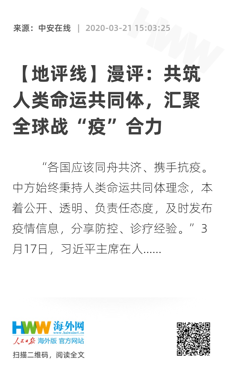 “各国应该同舟共济、携手抗疫。中方始终秉持人类命运共同体理念,本着公开、透明、负责任态度,及时发布疫情信息,分享防控、诊疗经验。”3月17日,习近平主席在人民大会堂同巴基斯坦总统阿尔维会谈,表达了愿为全球战“疫”贡献更多力量的强烈意愿。