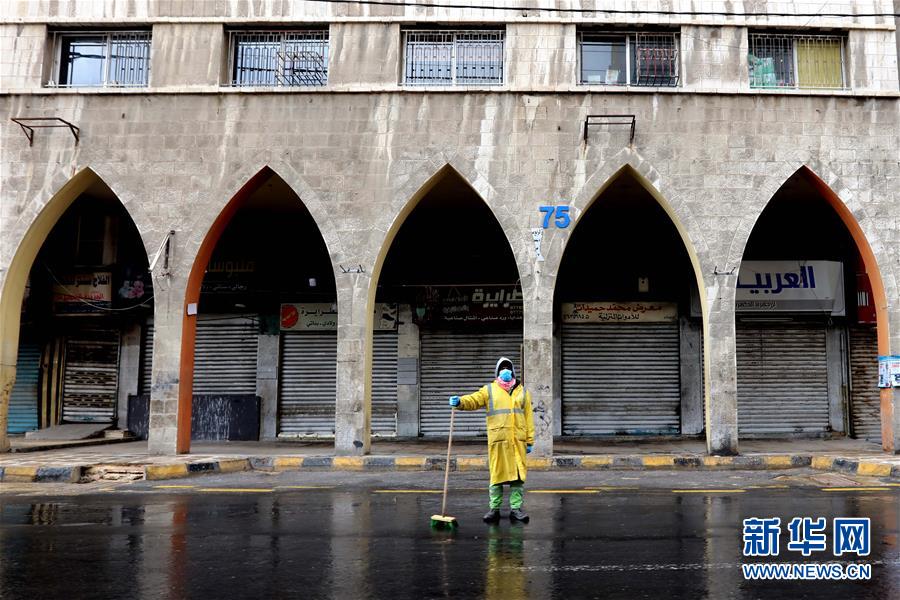 3月21日,在约旦首都安曼,清洁人员打扫街道。 当天是约旦强制民众居家隔离第一天。约旦政府20日宣布,从21日起把居家隔离升级为强制措施,以应对新冠肺炎疫情。截至20日,约旦累计新冠肺炎确诊病例69例,治愈1例。 新华社发(穆罕默德·阿布·古什 摄)