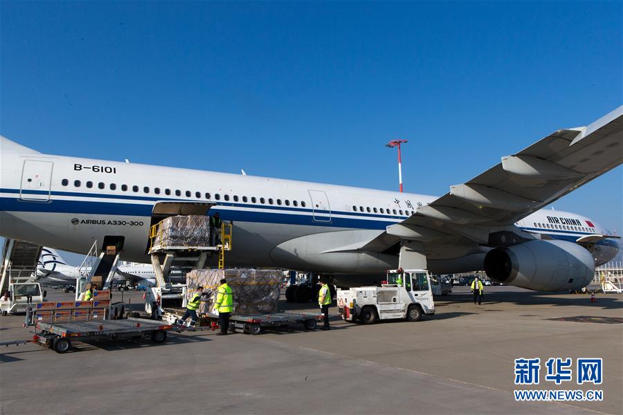 3月21日,在希腊雅典国际机场,工作人员从国航飞机上卸载中国援助希腊的医疗物资。 当日,一批中国政府援助希腊用于抗击新冠肺炎疫情的物资空运抵达雅典国际机场。同机运抵的还有由中国企业和社会各界向希腊捐赠的物资。 新华社发(马里奥斯·罗洛斯 摄)
