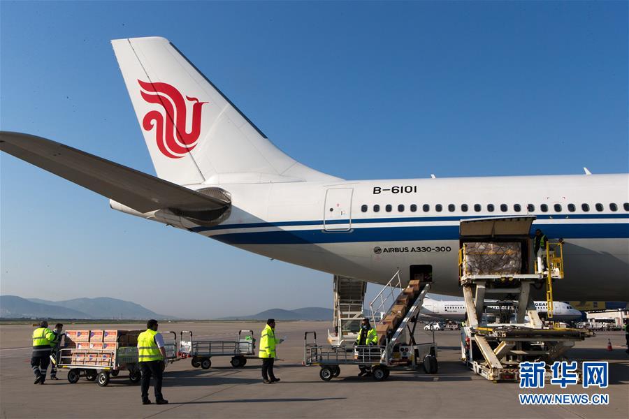 3月21日,在希腊雅典国际机场,工作人员从国航飞机上卸载中国援助希腊的医疗物资。 当日,一批中国政府援助希腊用于抗击新冠肺炎疫情的物资空运抵达雅典国际机场。同机运抵的还有由中国企业和社会各界向希腊捐赠的物资。 新华社发(马里奥斯·罗洛斯 摄)