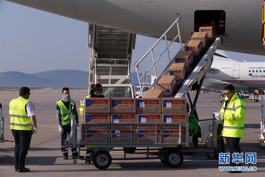 3月21日,在希腊雅典国际机场,工作人员从国航飞机上卸载中国援助希腊的医疗物资。 当日,一批中国政府援助希腊用于抗击新冠肺炎疫情的物资空运抵达雅典国际机场。同机运抵的还有由中国企业和社会各界向希腊捐赠的物资。 新华社发(马里奥斯·罗洛斯 摄)