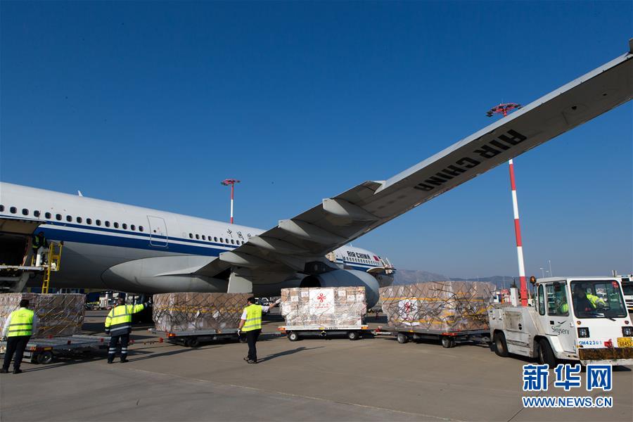 3月21日,在希腊雅典国际机场,工作人员从国航飞机上卸载中国援助希腊的医疗物资。 当日,一批中国政府援助希腊用于抗击新冠肺炎疫情的物资空运抵达雅典国际机场。同机运抵的还有由中国企业和社会各界向希腊捐赠的物资。 新华社发(马里奥斯·罗洛斯 摄)