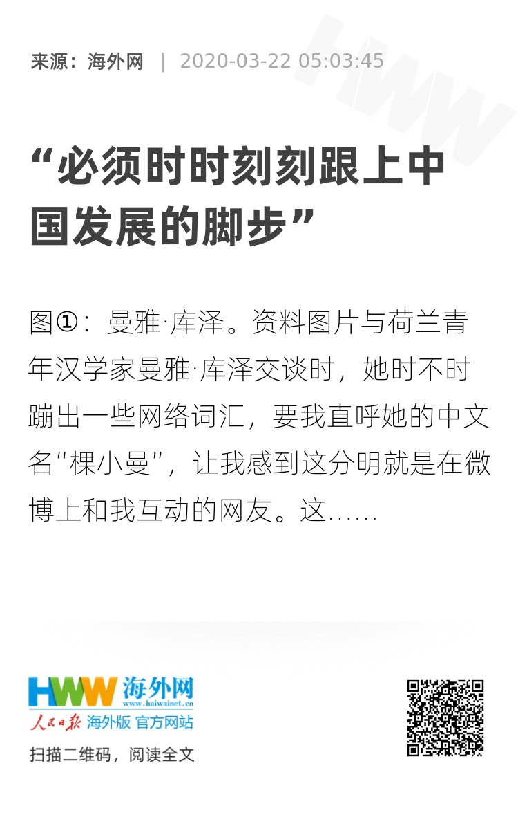 荷兰青年汉学家曼雅·库泽交谈时,她时不时蹦出一些网络词汇,要我直呼她的中文名“棵小曼”,让我感到这分明就是在微博上和我互动的网友。这与她的职业息息相关。2014年,棵小曼创办了网站“微博上有什么”,向网民介绍中国各大社交媒体平台上的热点新闻,至今已发表近1000篇文章,月均点击量超过30万,成为当地网民了解当代中国社会的一扇窗口。