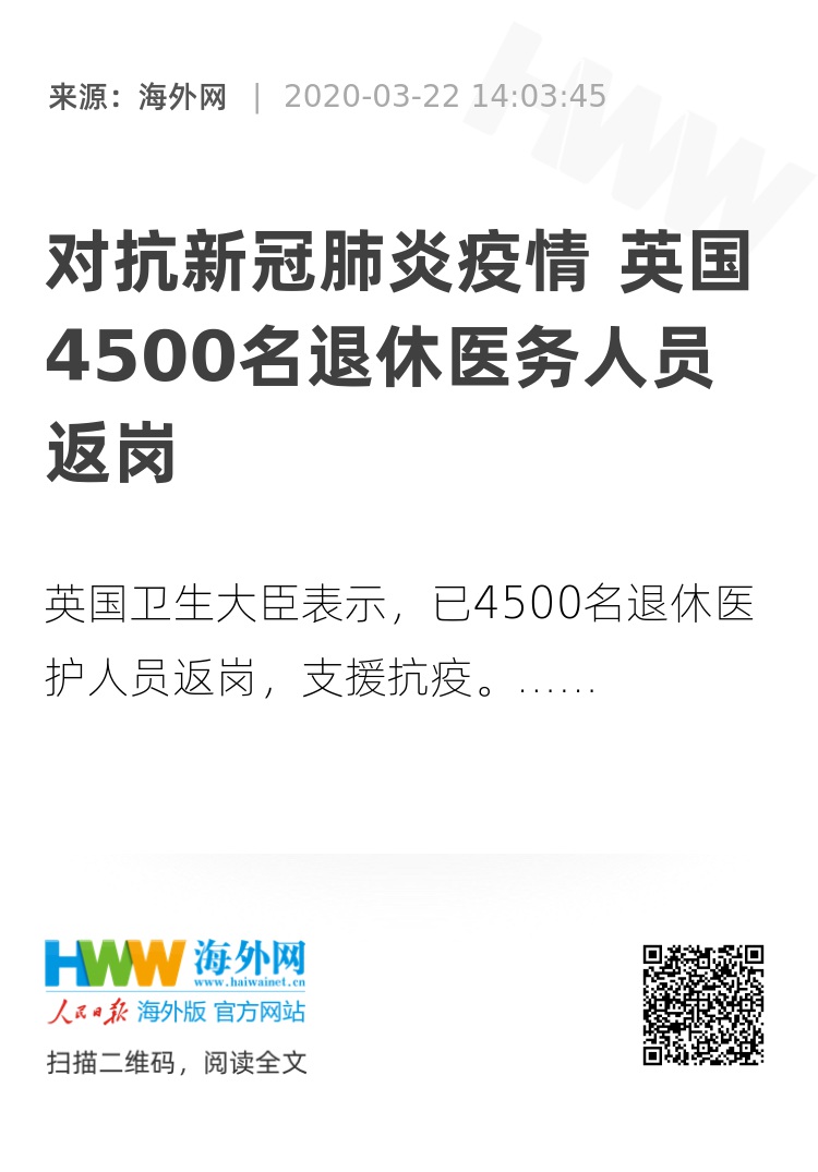 【海外网3月22日|战疫全时区】英国卫生大臣表示,已4500名退休医护人员返岗,帮助英国对抗新冠肺炎疫情的爆发。