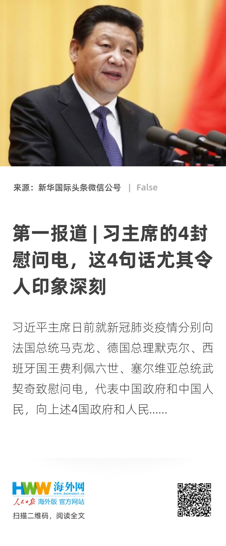此次4封慰问电,再次表达了中国愿同世界各国互帮互助、共同打赢疫情防控阻击战的决心和担当。