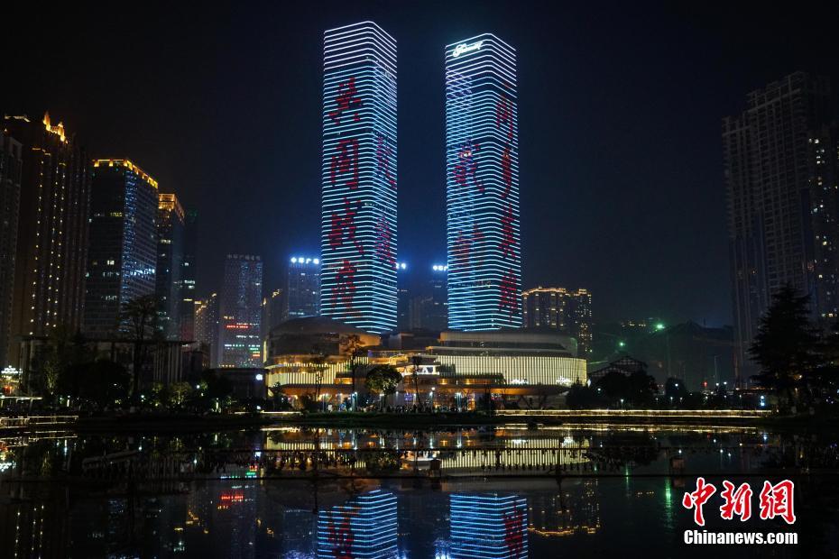 3月21日晚,贵阳市花果园双子塔循环播放欢迎支援湖北医疗队医护人员回家宣传语,欢迎“最美逆行者”回家。中新社记者 瞿宏伦 摄