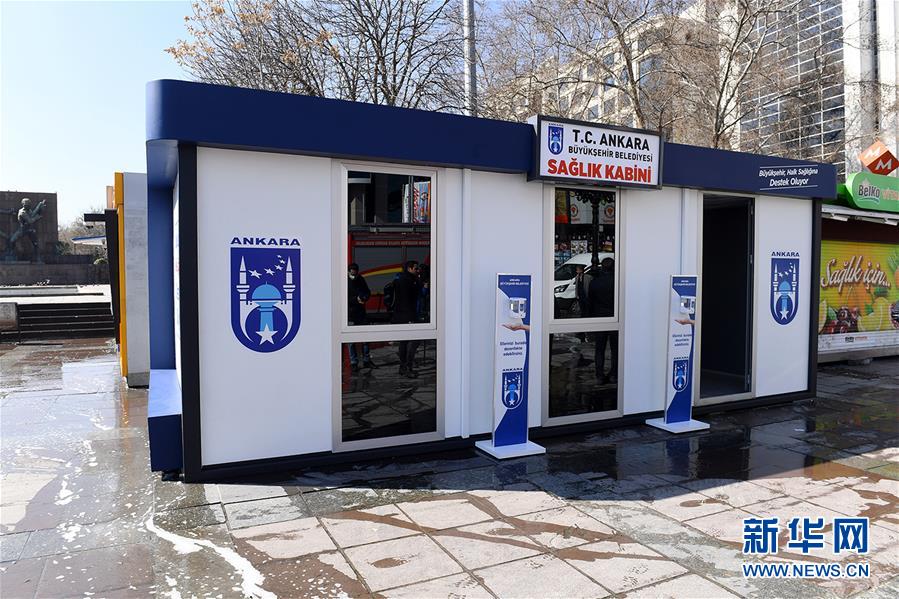 这是3月22日在土耳其安卡拉拍摄的一个“卫生舱”。安卡拉市政府在市内建立了“卫生舱”,每个卫生舱配备1名医生和2名护士,为市民进行消毒和检测服务。 土耳其卫生部长科贾22日在社交媒体推特上说,该国新增新冠肺炎确诊病例289例,累计确诊1236例;新增死亡病例9例,累计死亡30例。 新华社发(穆斯塔法·卡亚摄)