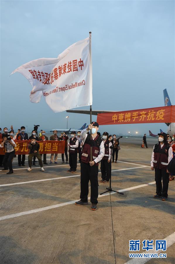 3月23日,在南宁吴圩国际机场,专家组成员挥舞旗帜。 当日,由国家卫生健康委员会组建,广西壮族自治区卫健委选派的抗疫医疗专家组启程前往柬埔寨。 新华社记者 曹祎铭 摄