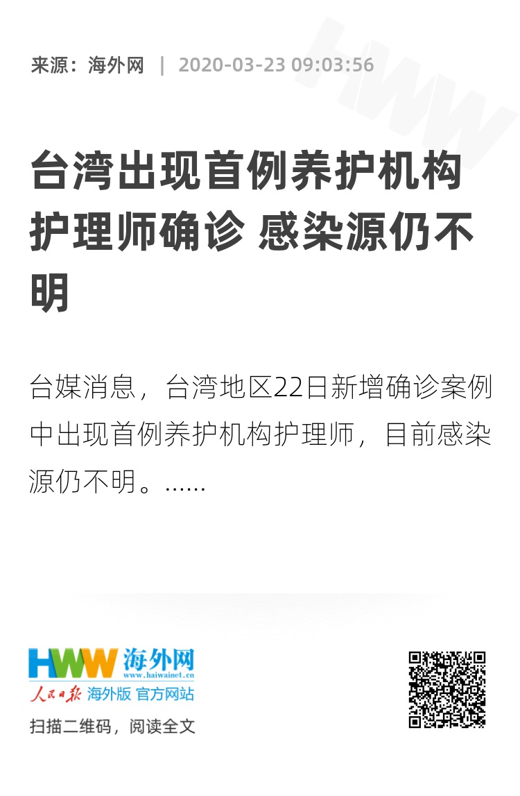 据台湾“联合新闻网”报道,台湾地区22日新增本土确诊案例中有一名护理师,为台湾确诊的首例养护机构护理师,所在机构53名住户和28名工作人员已经全部迁出或居家隔离,新冠肺炎病毒检测初步筛查均为阴性。