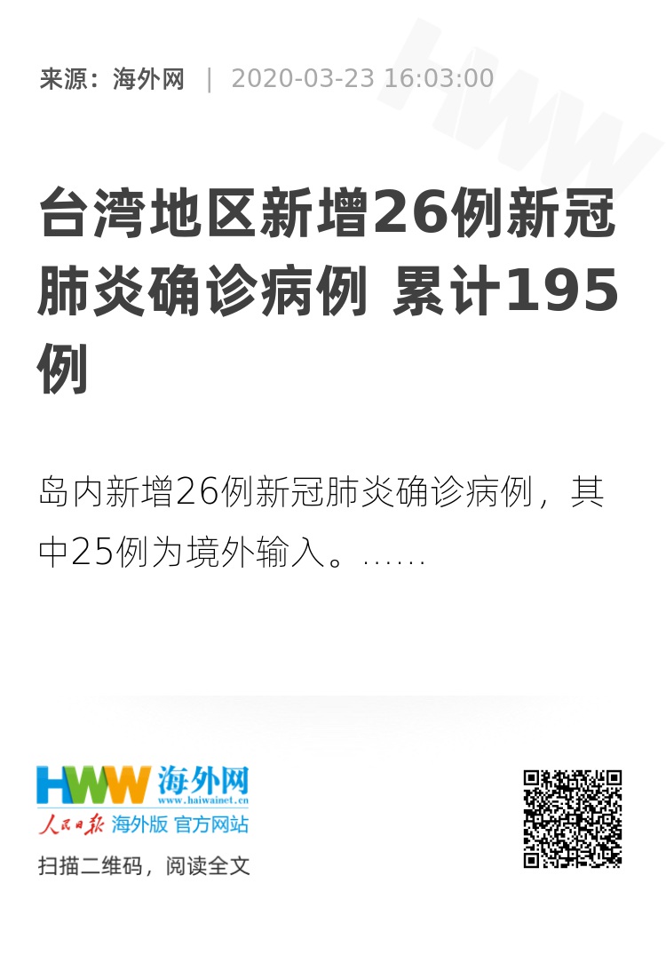 【海外网3月23日|战疫全时区】据台湾“中央社”报道,台湾地区流行疫情指挥中心今(23)日公布,岛内新增26例新冠肺炎确诊病例,其中25例为境外输入,1例本土案例,台湾地区累计确诊病例达195例。(海外网 杨佳)