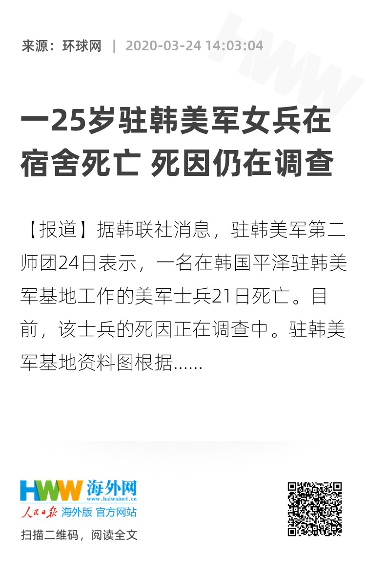 31750143,.一25岁驻韩美军女兵在宿舍死亡 死因仍在调查,.2020-03-24 14:35:04,.204417,.袁如霞