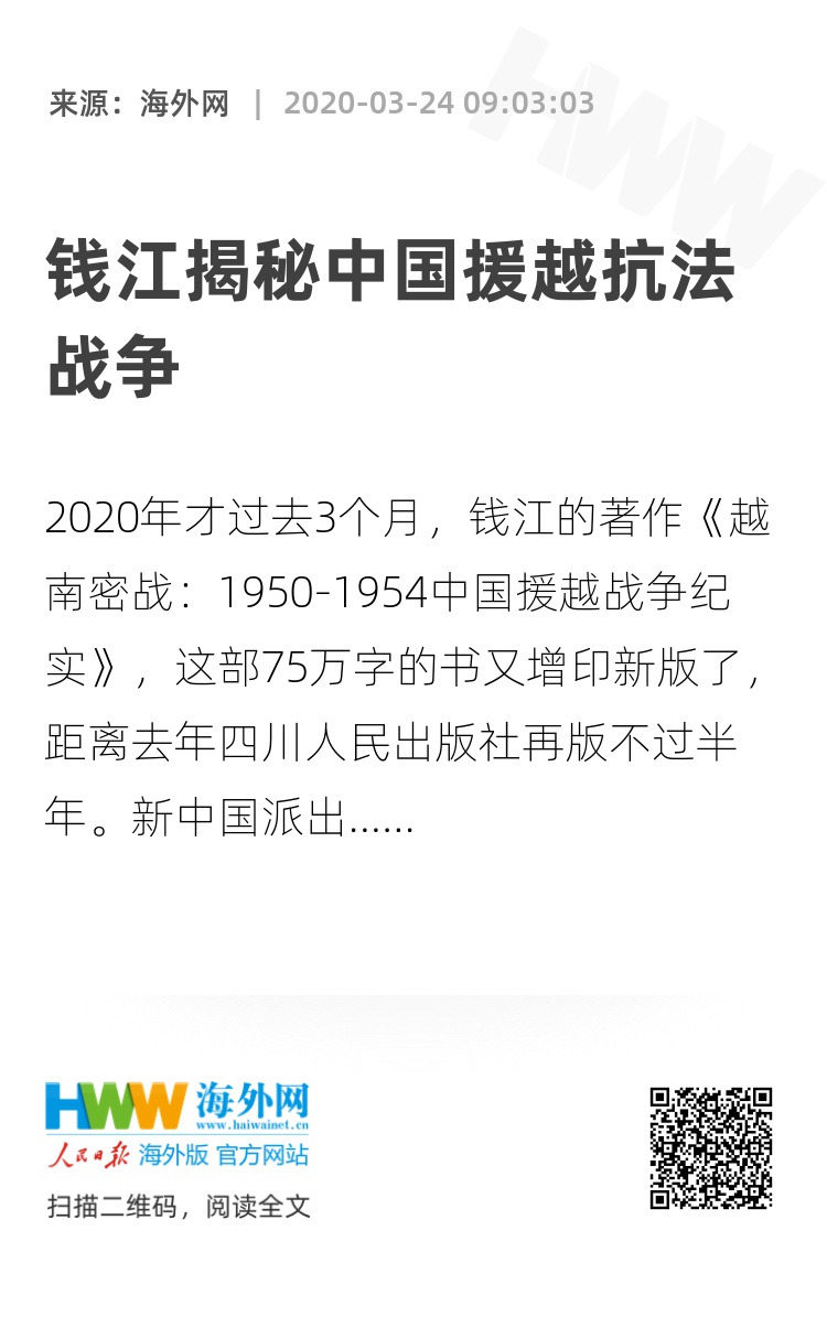 2020年才过去3个月,钱江的著作《越南密战:1950-1954中国援越战争纪实》,这部75万字的书又增印新版了,距离去年四川人民出版社再版不过半年。