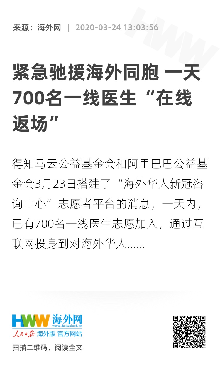 得知马云公益基金会和阿里巴巴公益基金会3月23日搭建了“海外华人新冠咨询中心”志愿者平台的消息,一天内,已有700名一线医生志愿加入,通过互联网投身到对海外华人的在线新冠肺炎防治咨询志愿服务中来。