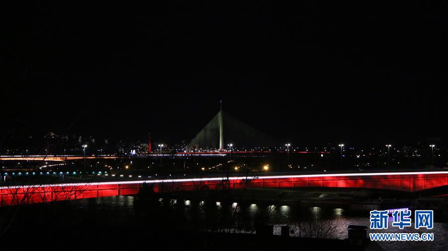 塞尔维亚首都贝尔格莱德市国民议会大厦、阿达桥等标志性建筑21日和22日晚点亮了象征中国国旗的红色,以这种特殊的方式向中国援塞抗疫医疗专家组的到来表示感谢。中国援助塞尔维亚抗疫医疗专家组一行6人21日晚乘专机抵达塞首都贝尔格莱德,由中国政府捐赠的一批医疗物资同机抵达。新华社发(内马尼亚摄)