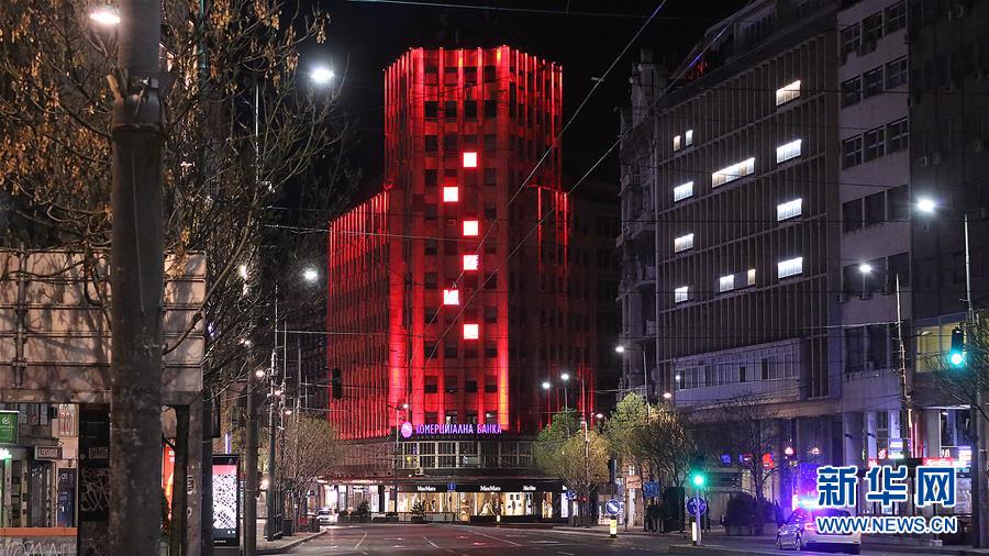 塞尔维亚首都贝尔格莱德市国民议会大厦、阿达桥等标志性建筑21日和22日晚点亮了象征中国国旗的红色,以这种特殊的方式向中国援塞抗疫医疗专家组的到来表示感谢。中国援助塞尔维亚抗疫医疗专家组一行6人21日晚乘专机抵达塞首都贝尔格莱德,由中国政府捐赠的一批医疗物资同机抵达。新华社发(内马尼亚摄)
