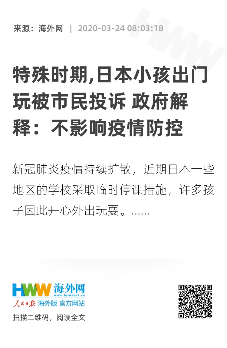 【海外网3月24日|战疫全时区】新冠肺炎疫情持续扩散,近期日本一些地区的学校采取临时停课措施,许多孩子因此开心外出玩耍。对此,一些居民向各地学校和教育委员会不满反映称“现在的情况违背了停课初衷”。也有学校向家长发邮件进行提醒。但日本文部科学省在最新通知中指出,为保童学生健康,可进行适度的室外运动和散步,不影响疫情防控。