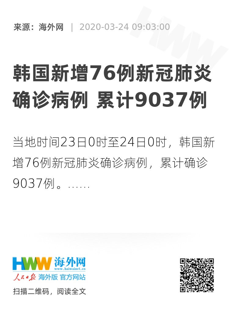 【海外网3月24日|战疫全时区】据韩联社24日消息,韩国中央防疫对策本部当天通报,当地时间23日0时至24日0时,韩国新增76例新冠肺炎确诊病例,累计确诊9037例,新增死亡病例9例,累计死亡病例达120例,新增治愈341例,累计治愈3507人。