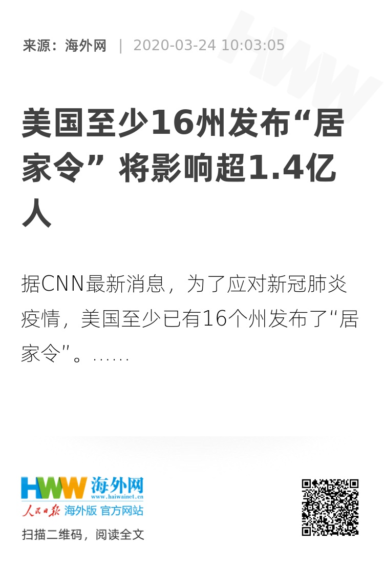 【海外网3月24日|战疫全时区】据CNN最新消息,为了应对新冠肺炎疫情,美国至少已有16个州发布了“居家令”(stay-at-home order)。目前已经发布并生效的“居家令”已经使得全美超过1.005亿人的出行受到限制,约占全国人口的31%。当16个州的“居家令”全部生效时,将影响超1.42亿人,占全美人口的43%。