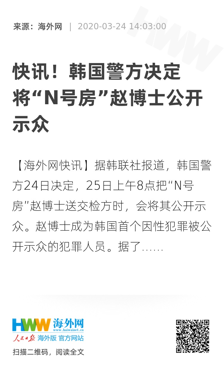 【海外网快讯】据韩联社报道,韩国警方24日决定,25日上午8点把“N号房”赵博士送交检方时,会将其公开示众。赵博士成为韩国首个因性犯罪被公开示众的犯罪人员。
