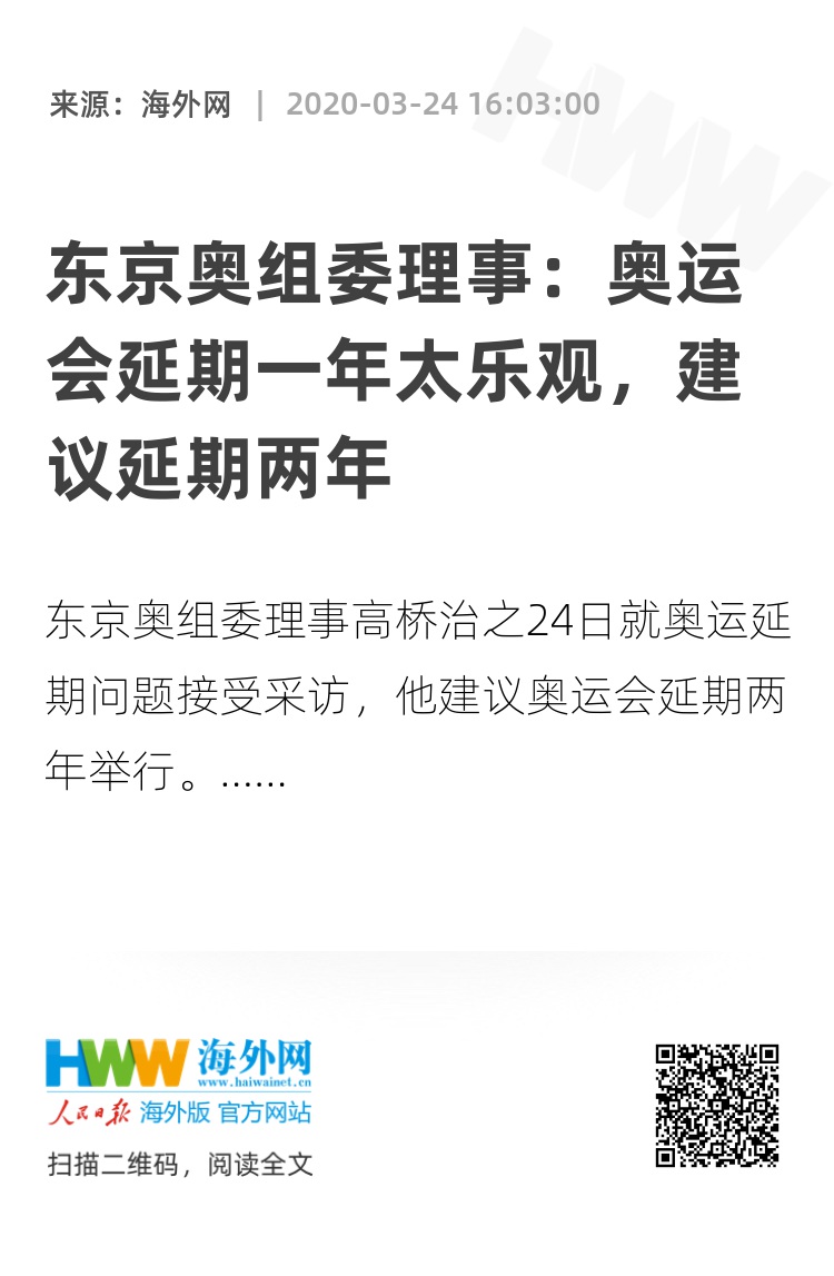 报道称,高桥表示虽然目前延期一年举行方案被讨论的最多,但他认为该方案过于乐观,因为疫情有可能进一步扩大,一年后世界范围内疫情未必能完全结束,届时如果再次延期会非常困难,因此他建议奥运会延期两年举行。