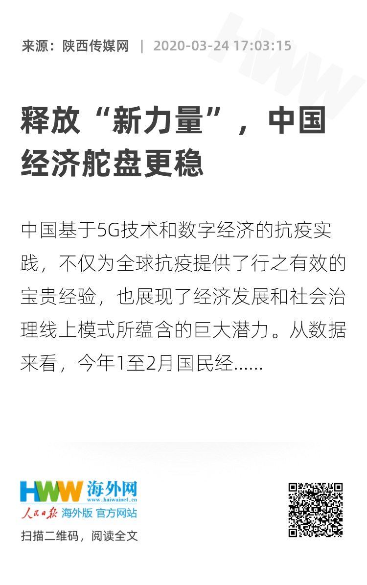 中国基于5G技术和数字经济的抗疫实践,不仅为全球抗疫提供了行之有效的宝贵经验,也展现了经济发展和社会治理线上模式所蕴含的巨大潜力。从数据来看,今年1至2月国民经济经受住了新冠肺炎疫情冲击,强大的经济发展韧性并未改变。新业态不断涌现、新商业红红火火、新动能加速集聚……释放“新力量”,中国经济舵盘更稳。