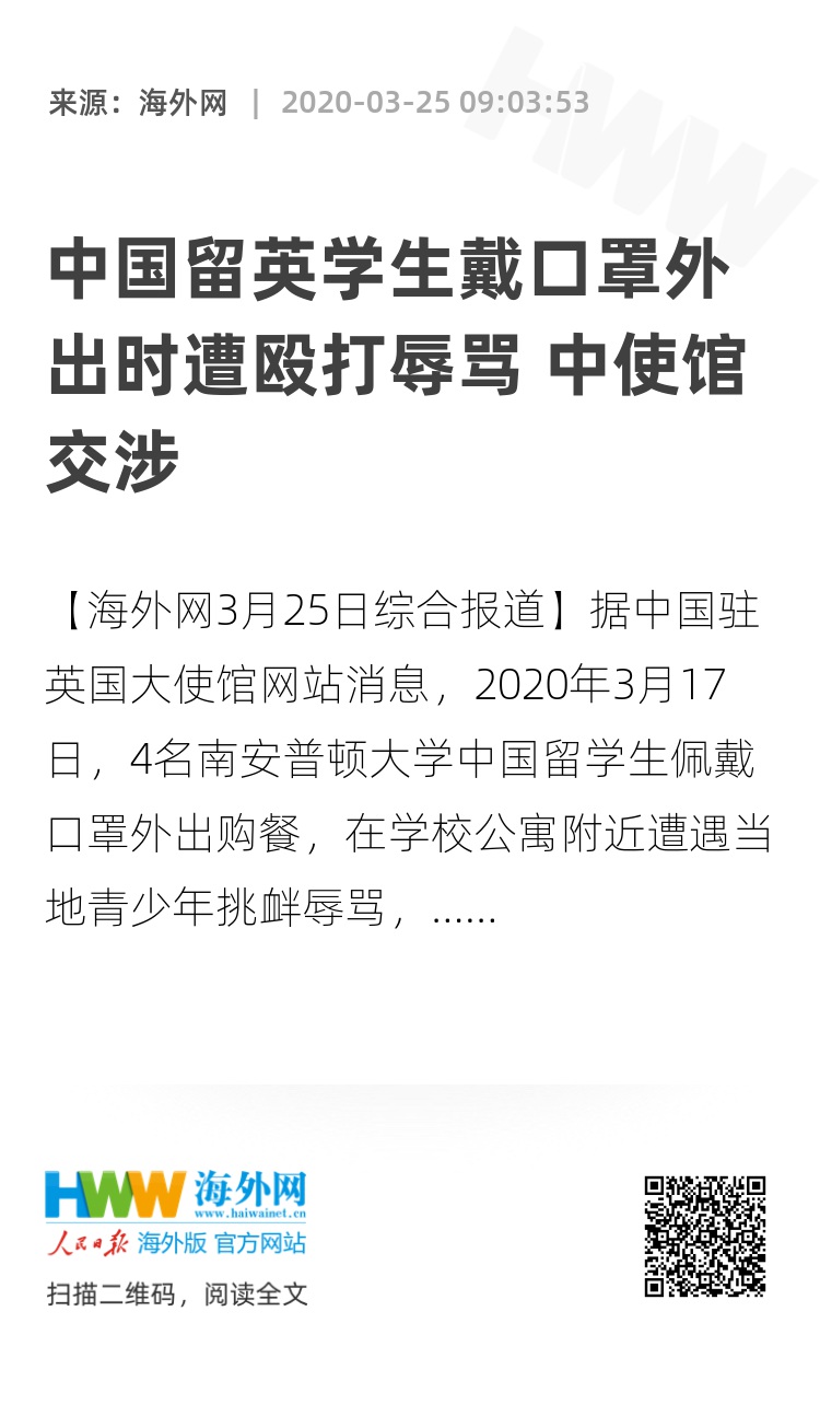 【海外网3月25日综合报道】据中国驻英国大使馆网站消息,2020年3月17日,4名南安普顿大学中国留学生佩戴口罩外出购餐,在学校公寓附近遭遇当地青少年挑衅辱骂,双方发生肢体冲突,1名中国留学生被殴打。我留学生及时报警,当地警方以涉嫌斗殴逮捕两名肇事者。遇袭学生伤势不重,生活未受影响。当地媒体报道了此事件。
