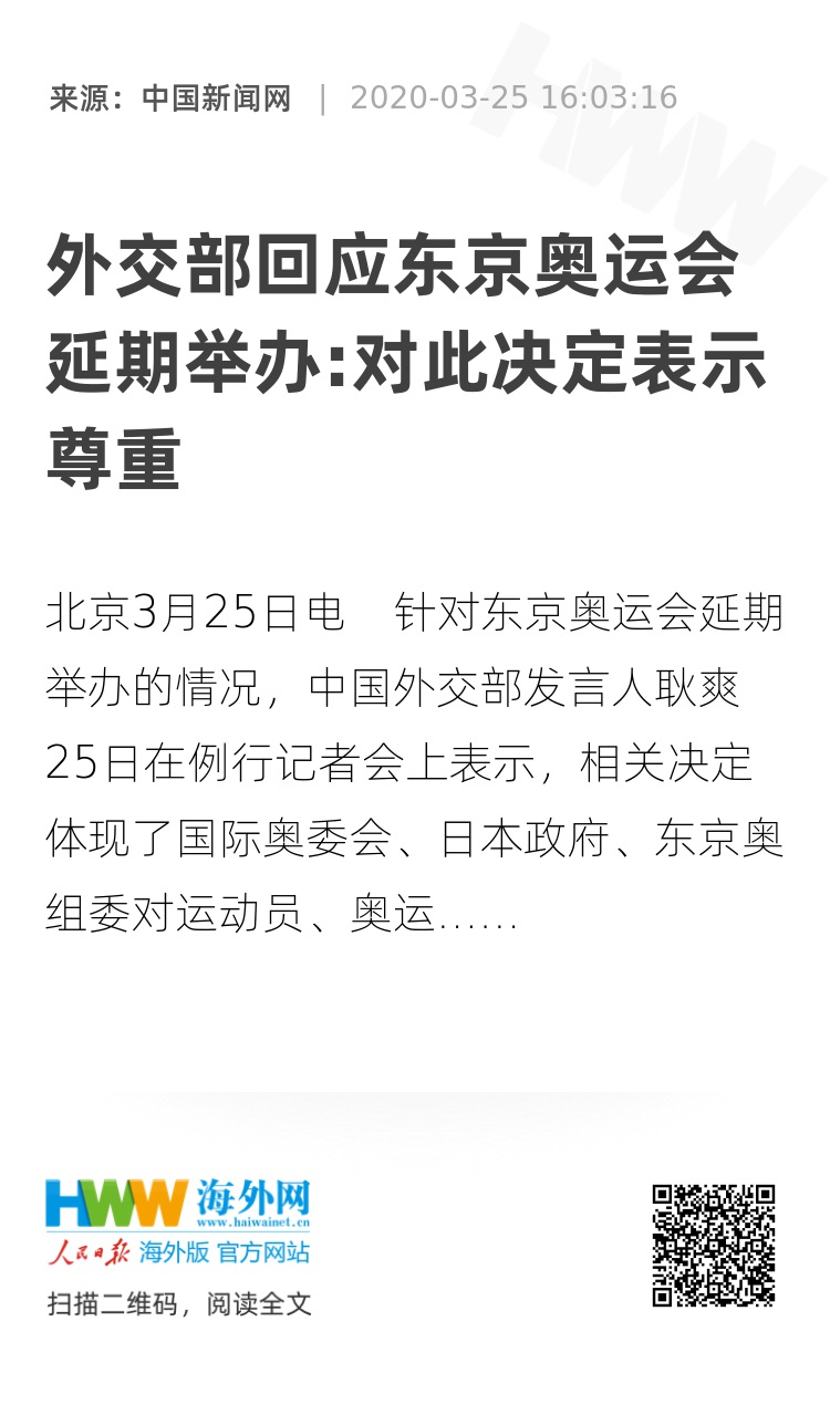中新网北京3月25日电 针对东京奥运会延期举办的情况,中国外交部发言人耿爽25日在例行记者会上表示,相关决定体现了国际奥委会、日本政府、东京奥组委对运动员、奥运会参与者和人类健康安全负责任的态度,也体现了国际奥委会对奥林匹克运动的承诺,我们对此决定表示尊重,中方将会继续支持日方举办东京奥运会。(黄钰钦)