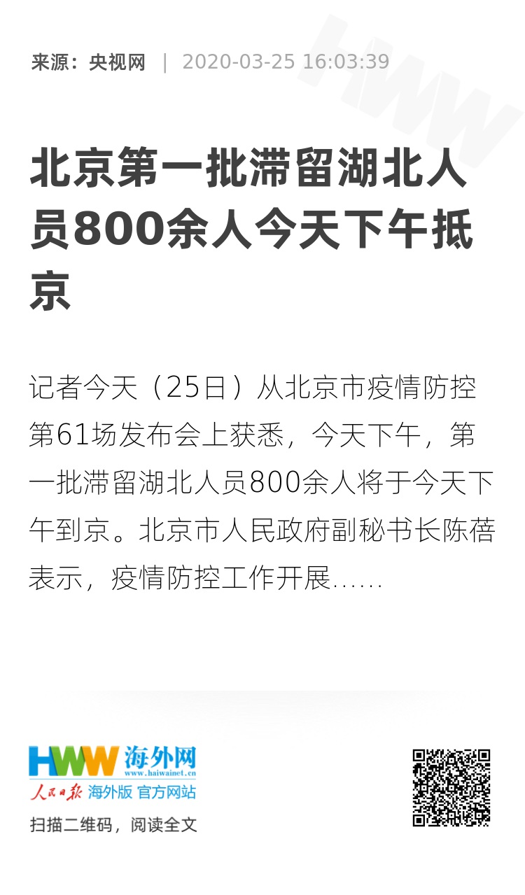 记者今天(25日)从北京市疫情防控第61场发布会上获悉,今天下午,第一批滞留湖北人员800余人将于今天下午到京。
