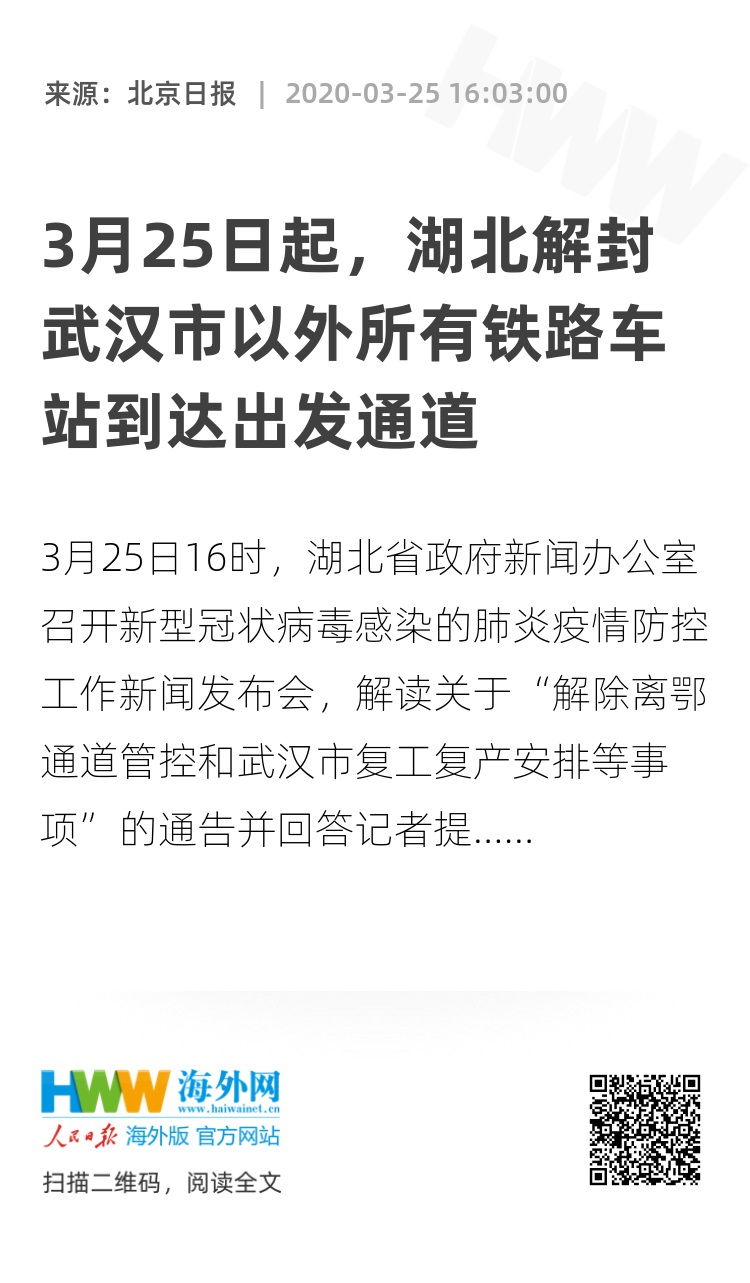 湖北省交通运输厅副厅长王本举介绍,从3月25日零时起,恢复除武汉市以外的省内外旅客列车秩序,解封武汉市以外所有铁路车站的到达出发通道,推进中欧武汉班列等全部铁路货运正常营运。