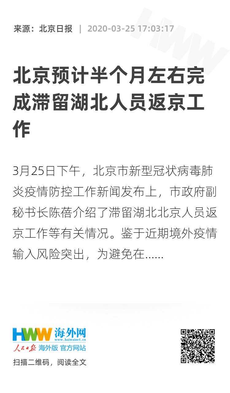 这次滞留湖北的北京人员的返京工作,大约利用半个月时间完成。在此也提示有返京意愿的朋友,尽快登陆“京心相助”小程序,提前向所在的单位和社区进行报告。(记者 孙乐琪)