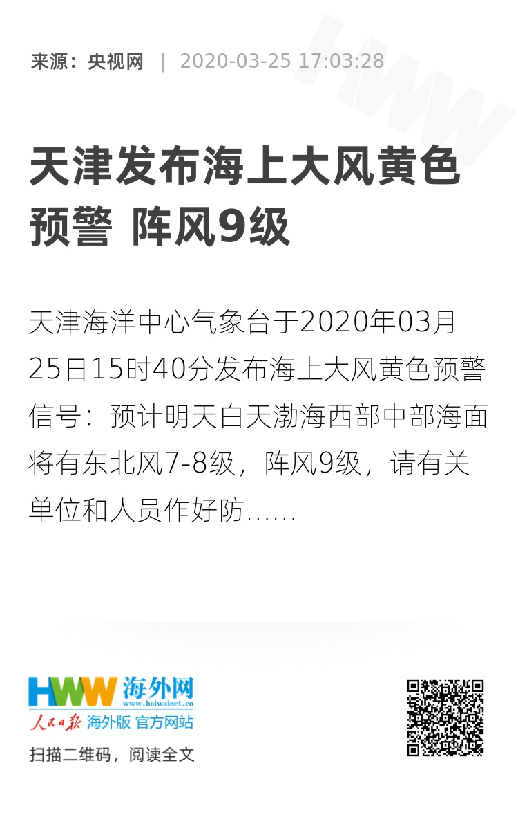 天津海洋中心气象台于2020年03月25日15时40分发布海上大风黄色预警信号:预计明天白天渤海西部中部海面将有东北风7-8级,阵风9级,请有关单位和人员作好防范准备。相关部门提醒,受大风影响,海域航行、作业的船舶,需注意航行安全。(总台央视记者 丁旭 王晓沛)