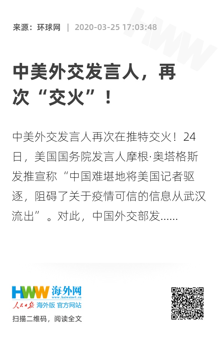 中美外交发言人再次在推特交火!24日,美国国务院发言人摩根·奥塔格斯发推宣称“中国难堪地将美国记者驱逐,阻碍了关于疫情可信的信息从武汉流出”。对此,中国外交部发言人华春莹连发3条推特回击,她质问美方“指责中国阻碍信息传播,但却驱逐中国记者”,“是在惧怕什么?企图遮掩什么?他们真的以为他们可以让中国闭嘴,而不承担任何后果吗?”