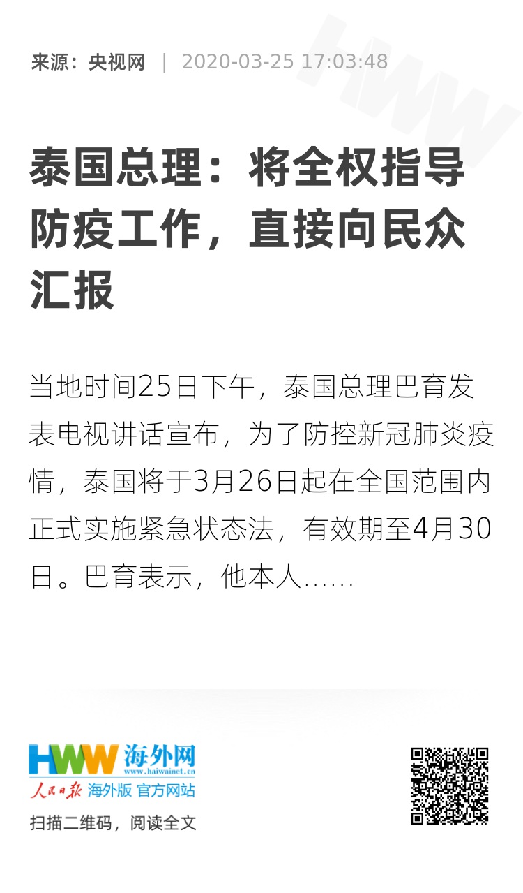 当地时间25日下午,泰国总理巴育发表电视讲话宣布,为了防控新冠肺炎疫情,泰国将于3月26日起在全国范围内正式实施紧急状态法,有效期至4月30日。