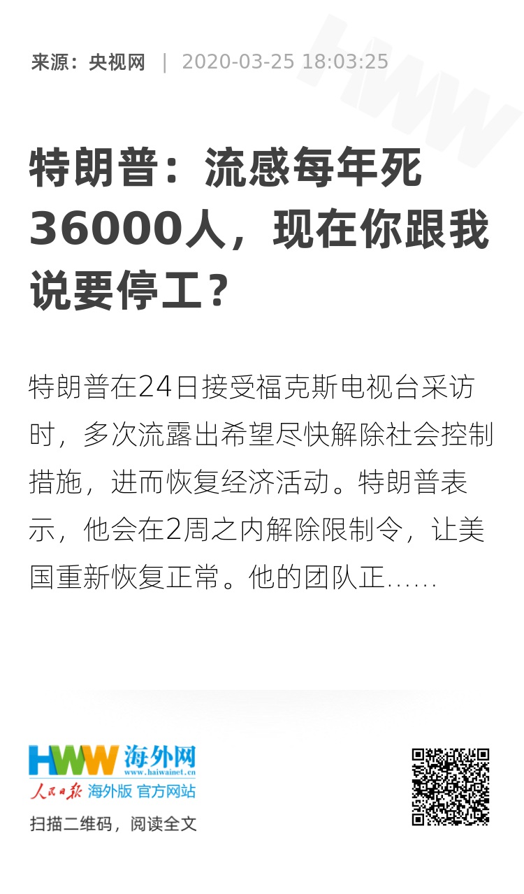 美国总统特朗普:我们之前有流感,每年平均死亡大概36000人。有些人跑来对我说,总统你这次必须得停工了。我说你到底在讲什么?我们有1.6亿人正在就业,你告诉我,我们要停工!然后人们做不了生意,失业甚至破产,你是认真的吗?
