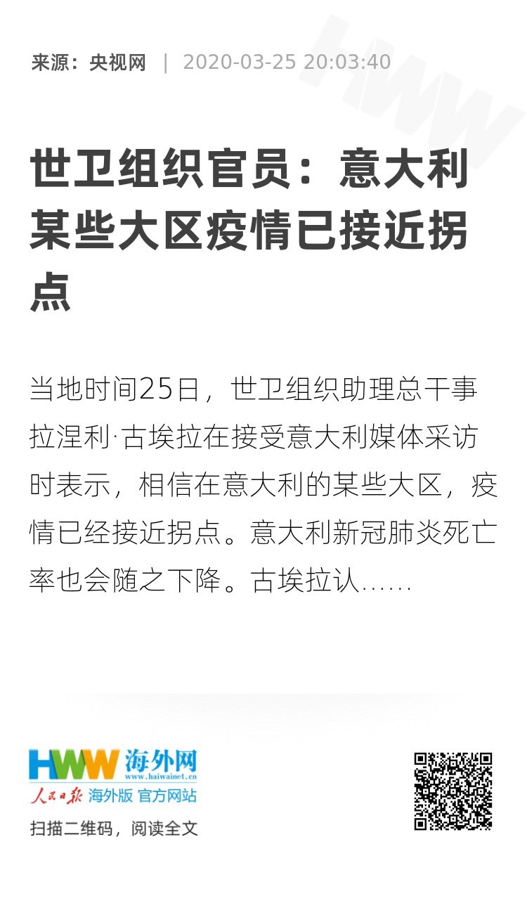 31751563,.世卫组织官员:意大利某些大区疫情已接近拐点,.2020-03-25 20:54:40,.204309,.陈亚楠