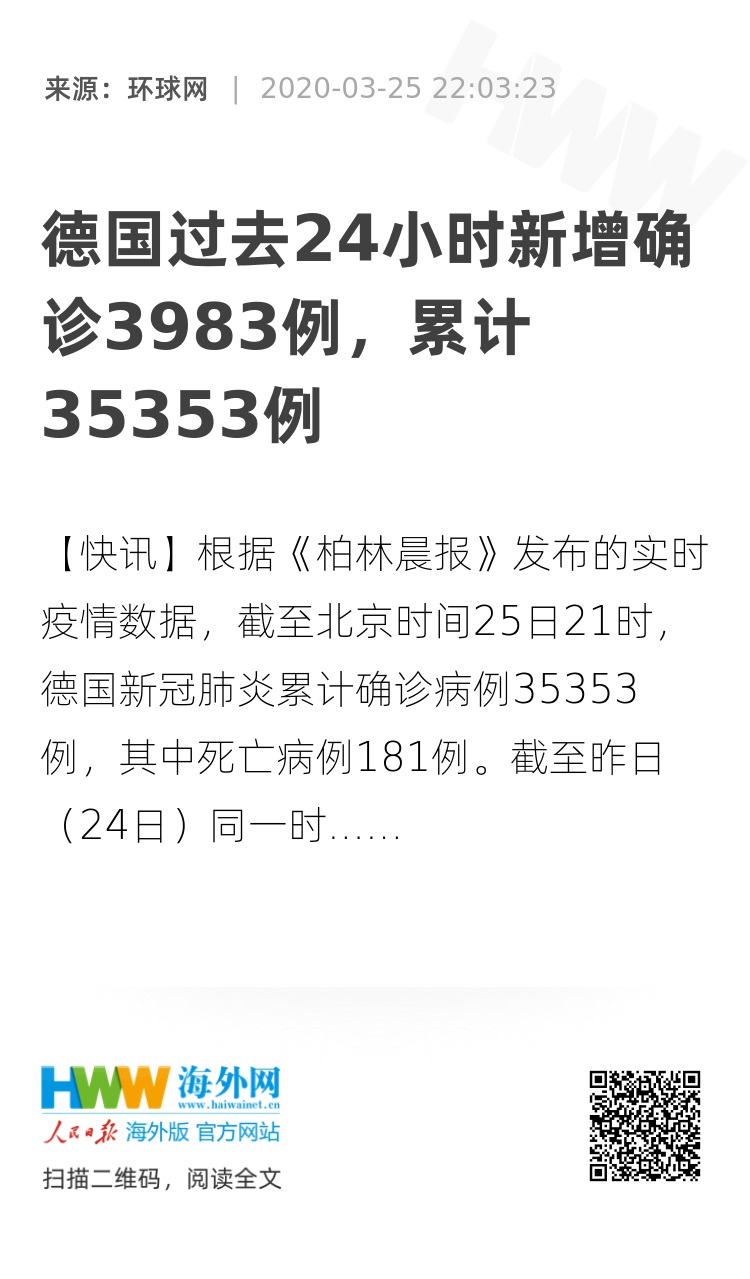 截至昨日(24日)同一时刻(21时),该国累计确诊31370例,累计死亡病例132例。因此,过去24小时,德国新增确诊病例3983例,新增死亡病例49例。