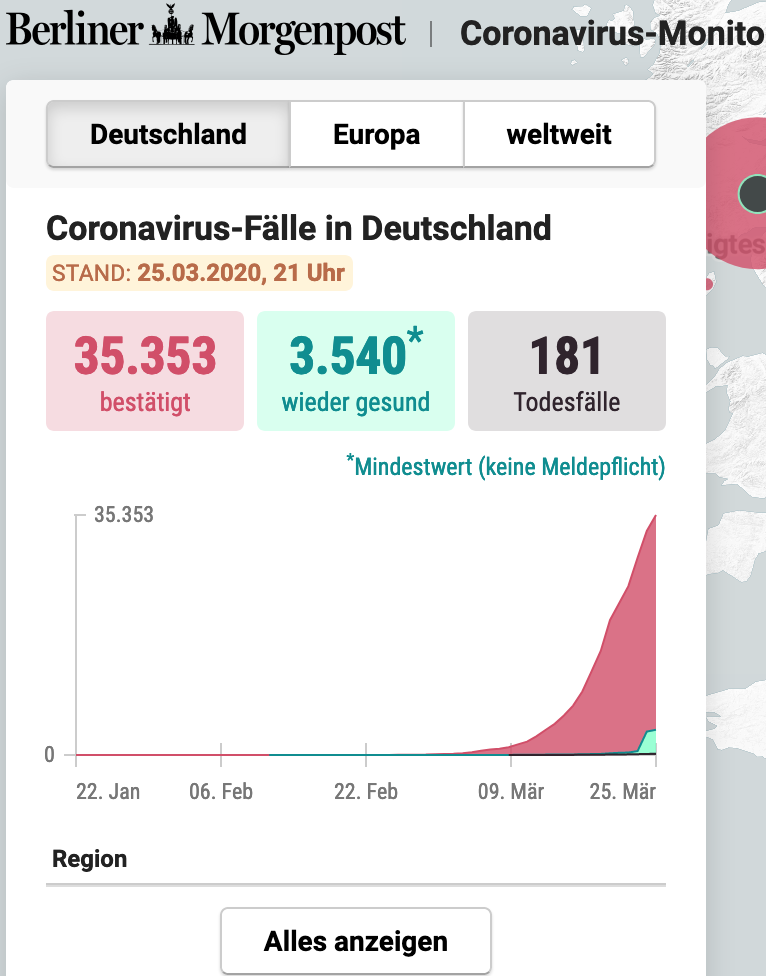 【环球网快讯】根据《柏林晨报》发布的实时疫情数据,截至北京时间25日21时,德国新冠肺炎累计确诊病例35353例,其中死亡病例181例。