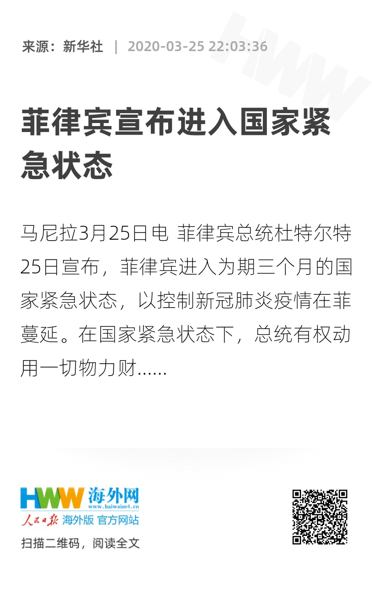 此前,由于疫情扩散,杜特尔特已先后宣布菲全国进入“公共卫生紧急状态”和“灾难状态”。