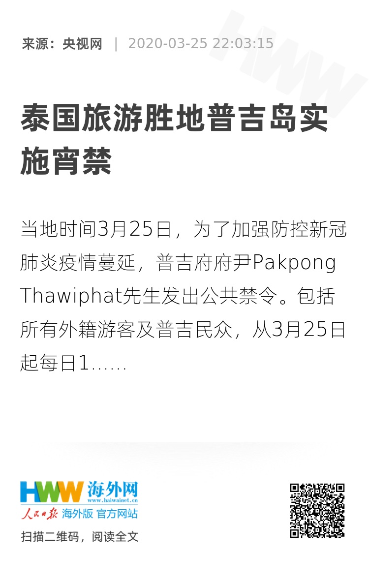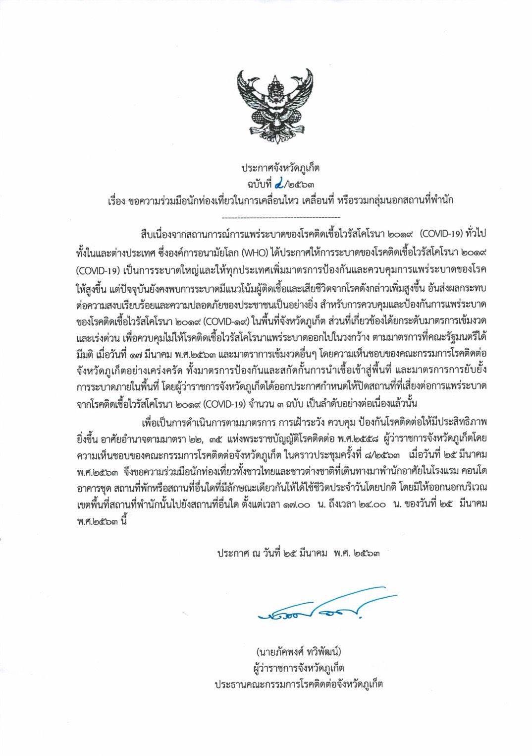 当地时间3月25日,为了加强防控新冠肺炎疫情蔓延,普吉府府尹Pakpong Thawiphat先生发出公共禁令。包括所有外籍游客及普吉民众,从3月25日起每日17:00-24:00执行“宵禁”政策,提醒民众积极配合,宵禁期间切勿离开住所或酒店。