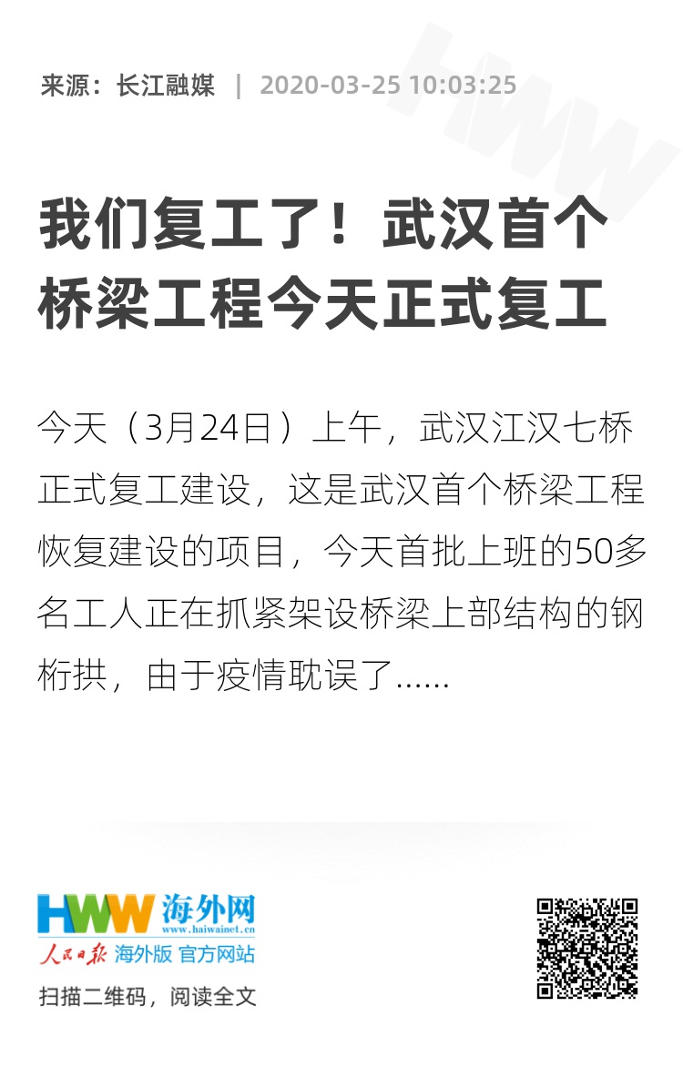 今天(3月24日)上午,武汉江汉七桥正式复工建设,这是武汉首个桥梁工程恢复建设的项目,今天首批上班的50多名工人正在抓紧架设桥梁上部结构的钢桁拱,由于疫情耽误了两个月的施工时间,中铁大桥局目前调整了施工安排,白天主要以桥梁上部结构施工为主,晚上是以桥梁地面阶段施工,采取同步施工,来确保进度推进。按照原计划,江汉七桥将在今年年底通车运行。