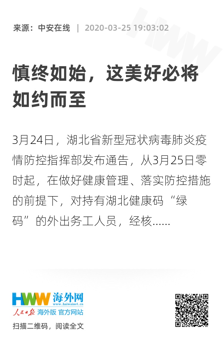 3月24日,湖北省新型冠状病毒肺炎疫情防控指挥部发布通告,从3月25日零时起,在做好健康管理、落实防控措施的前提下,对持有湖北健康码“绿码”的外出务工人员,经核酸检测合格后,采取“点对点、一站式”的办法集中精准输送,确保安全有序返岗。从4月8日零时起,武汉市解除离汉离鄂通道管控措施,有序恢复对外交通,离汉人员凭湖北健康码“绿码”安全有序流动。