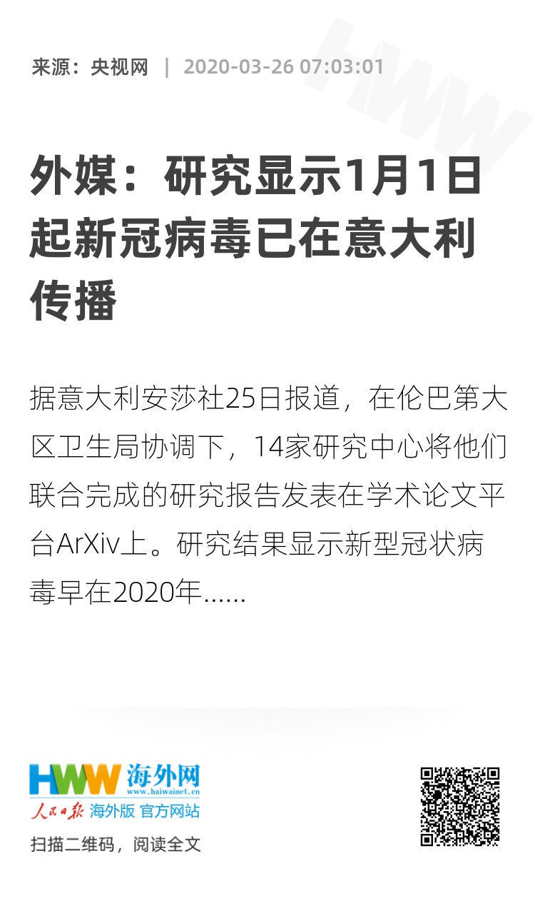 据意大利安莎社25日报道,在伦巴第大区卫生局协调下,14家研究中心将他们联合完成的研究报告发表在学术论文平台ArXiv上。研究结果显示新型冠状病毒早在2020年1月1日就开始在伦巴第大区流行,直到2月20日意大利1号病人被发现为止。对此,英国《自然》杂志25日在其网站上评论称,新冠肺炎疫情在被发现前已在意大利发展了数个星期。