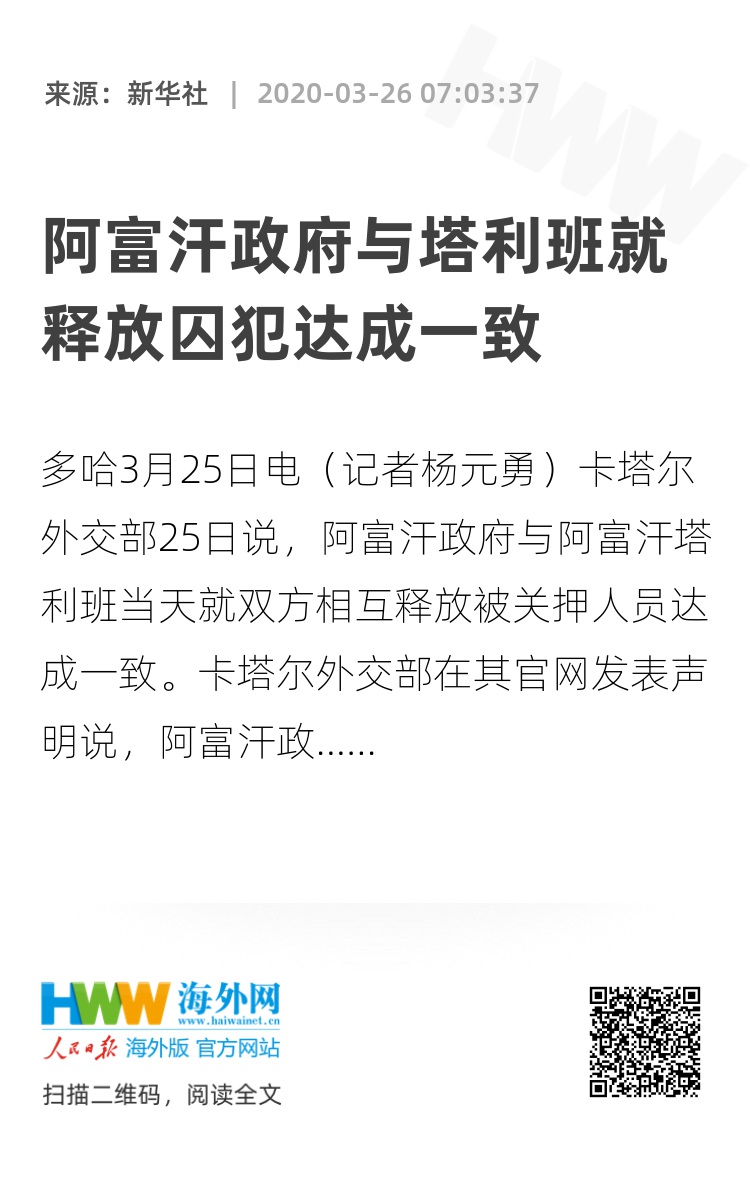 新华社多哈3月25日电(记者杨元勇)卡塔尔外交部25日说,阿富汗政府与阿富汗塔利班当天就双方相互释放被关押人员达成一致。