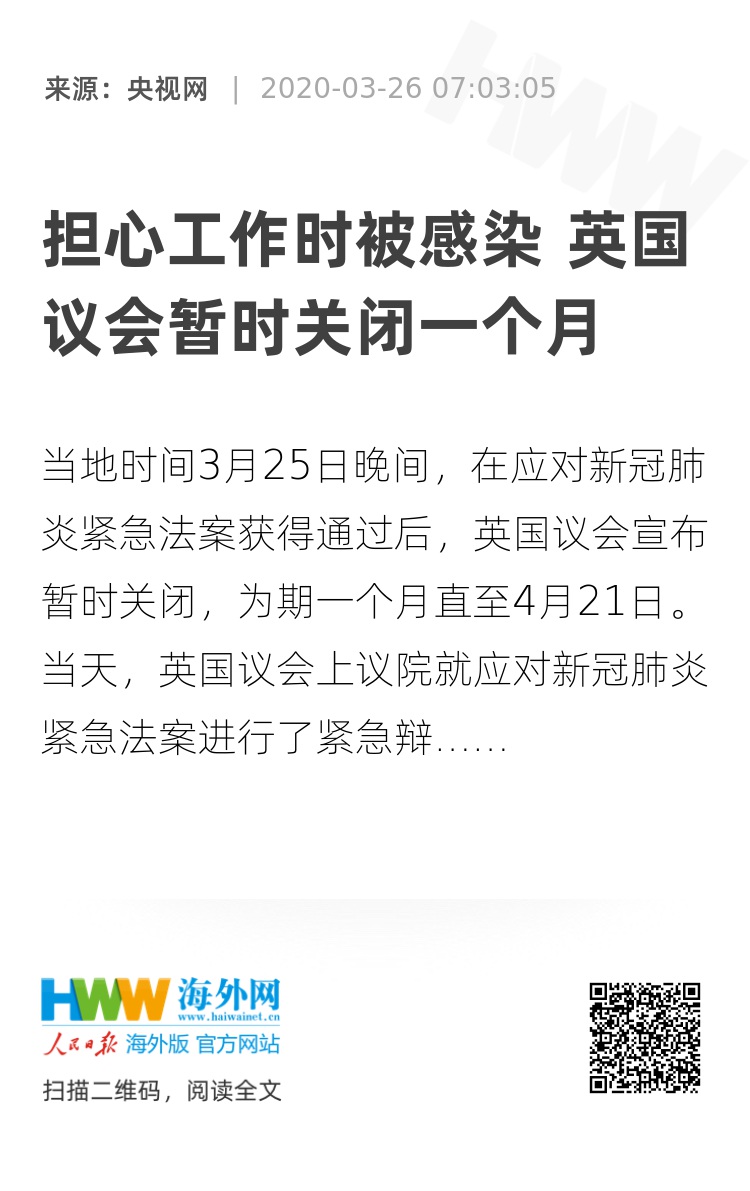 此外,苏格兰议会已于本周二关闭,议员将于4月1日重返议会为新冠肺炎疫情紧急立法。而在威尔士,在新冠肺炎疫情期间,议会全体会议将由“紧急情况”会议代替,只包括较少的成员。(总台记者 康玉斌)