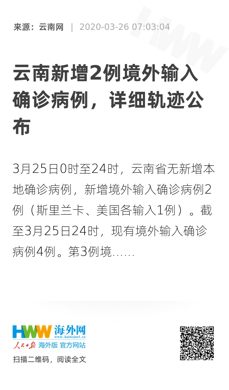 3月25日0时至24时,云南省无新增本地确诊病例,新增境外输入确诊病例2例(斯里兰卡、美国各输入1例)。截至3月25日24时,现有境外输入确诊病例4例。