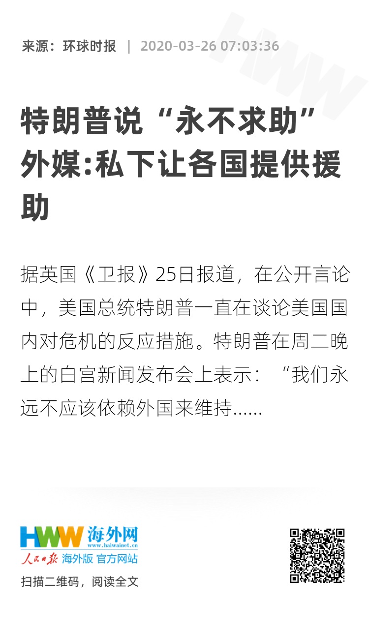 据英国《卫报》25日报道,在公开言论中,美国总统特朗普一直在谈论美国国内对危机的反应措施。特朗普在周二晚上的白宫新闻发布会上表示:“我们永远不应该依赖外国来维持我们自己的生存。”“美国永远不会成为一个求援的国家。”