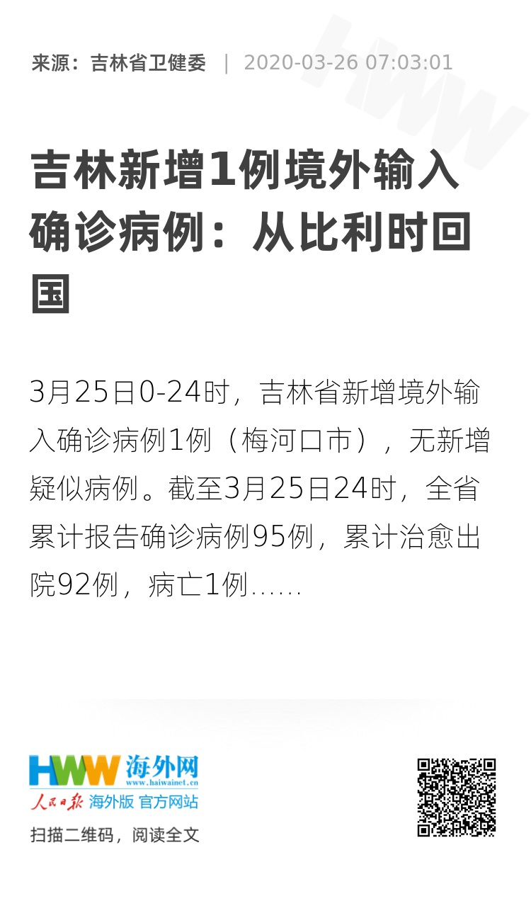 3月25日0-24时,吉林省新增境外输入确诊病例1例(梅河口市),无新增疑似病例。