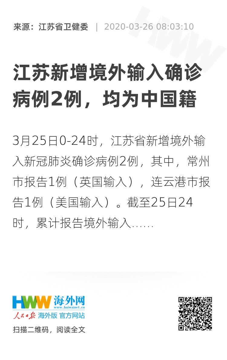 3月25日0-24时,江苏省新增境外输入新冠肺炎确诊病例2例,其中,常州市报告1例(英国输入),连云港市报告1例(美国输入)。截至25日24时,累计报告境外输入确诊病例9例。