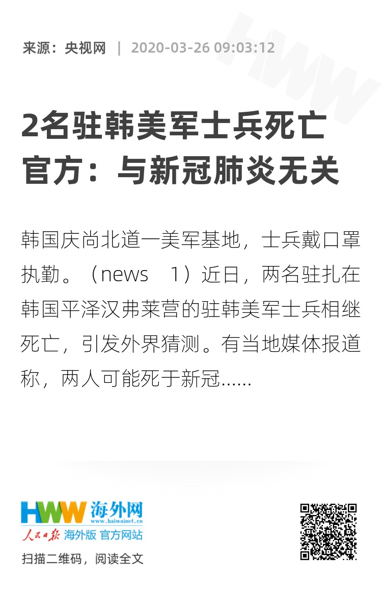 近日,两名驻扎在韩国平泽汉弗莱营的驻韩美军士兵相继死亡,引发外界猜测。有当地媒体报道称,两人可能死于新冠肺炎,对此驻韩美军26日给予了驳斥,称2人死亡原因仍在调查中,但均已排除与新冠肺炎有关。